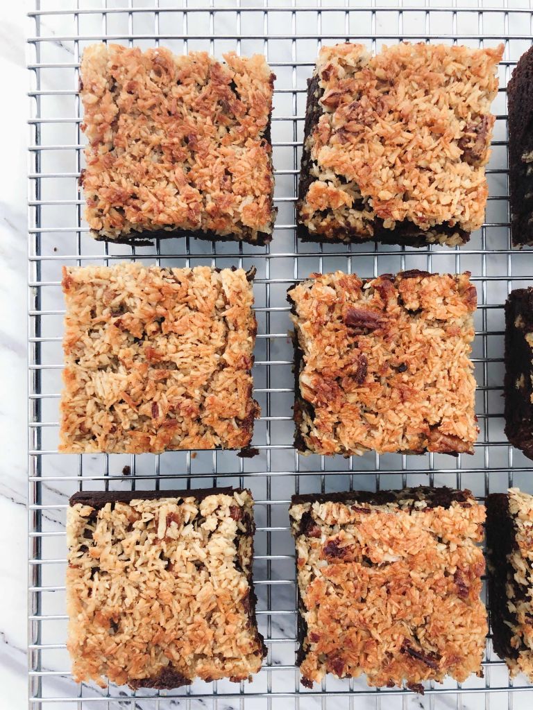 Whole Grain Rye Brownies with Toasted Coconut Pecan Topping
